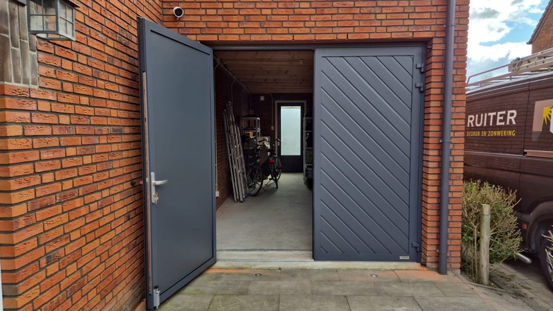 Voor dit bijzondere project realiseerden we een antracietkleurige openslaande garagedeur met diagonale S-profilering. In plaats van de gebruikelijke horizontale of verticale lijnen koos de klant voor een speelse, diagonale belijning die de deur een uniek karakter geeft. Dankzij de strakke afwerking en diepe antraciettint oogt het geheel modern en strak. Bij ADOOR is maatwerk altijd mogelijk, ook voor dit soort wensen. Hieronder zie je ook nog een foto van de deuren voordat deze geplaatst, opgesteld in onze werkplaats.